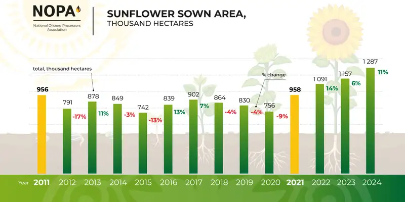 Казахстанские аграрии уверенно наращивают посевные площади под традиционной масличной культурой — подсолнечником. Если в 2021 году посевы подсолнечника в стране составляли всего 958 тыс. га, то в 2024 г. увеличились до рекордных 1,287 млн га (рост на 34%). Кстати, подсолнечник — единственная масличная культура, посевные площади которой на протяжении последних 4-х лет стабильно растут. Это говорит о высокой заинтересованности фермеров в производстве маслосемян. Конечно, играет свою роль и засухоустойчивость культуры, и более высокая рентабельность (по сравнению с производством зерновых).
