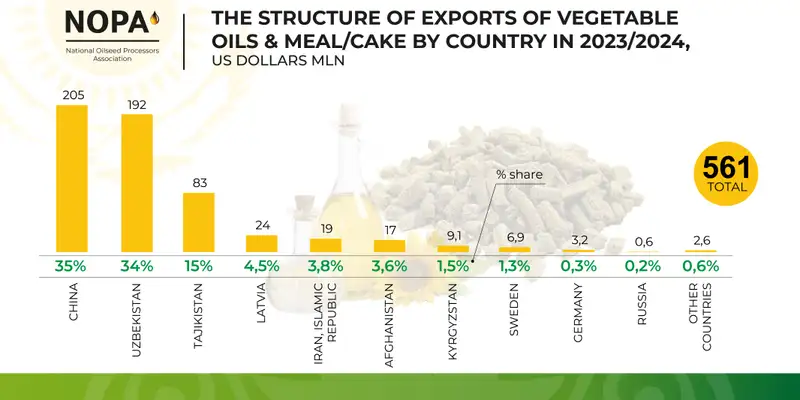 Отдельно стоит отметить развитие поставок масложировой продукции в страны Центральной Азии (Узбекистан, Таджикистан, Кыргызстан, Туркменистан). Согласно данным НАПМК, в 2023 году эти государства импортировали около 950 тысяч тонн растительных масел и шрота/жмыхов. При этом доля казахстанской масложировой продукции достигает половины в общем объеме импорта.