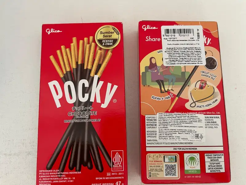 - Шоколадные палочки Pocky chokolate. Маркировка не соответствовала условиям легкочитаемости, а текст на казахском языке был представлен лишь частично: наименование продукта, а также наименование и адрес производителя.
