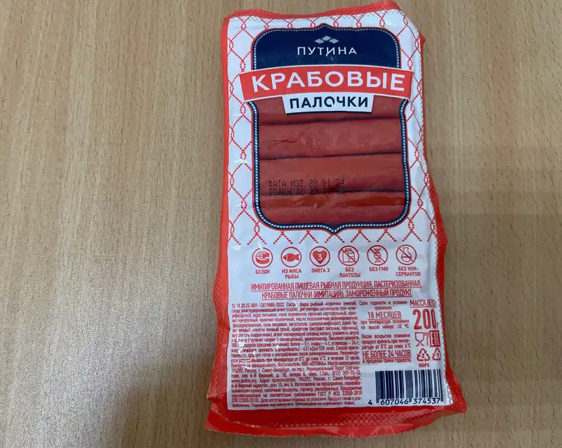 В потребительскую корзину вошли три продукта: рубленый мясной продукт из говядины "У каждого своя история 9" (302 г) от белорусского производителя, замороженная имитированная пищевая рыбная продукция "Крабовые палочки (имитация)" (200 г) от российского производителя и рисовые лепешки O'Food (290 г) из Кореи.