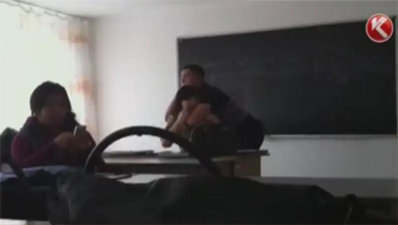 События происходят явно в Казахстане, правда, когда и в какой школе было снято это видео, автор не указал. На кадрах видно, как сначала свои физические возможности демонстрирует один школьник, а потом к нему присоединяются еще двое приятелей. Несмотря на просьбы одноклассниц, парни продолжают махать кулаками, правда, так и не достигая цели. Учительнице, окруженной хулиганами, ничего не остается, как отмахиваться от них тетрадкой. По некоторым данным, за случившееся так никого и не наказали.