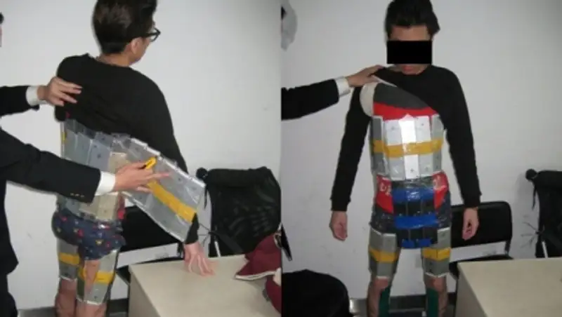 Странная неуверенная походка мужчины привлекла внимание таможенников. Жителя Гонконга попросили пройти через рамку металлоискателя, после чего секрет ее был раскрыт.