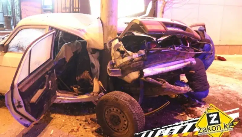 В Алматы водитель Nissan в результате ДТП "впечатал" Волгу в столб и сбежал
