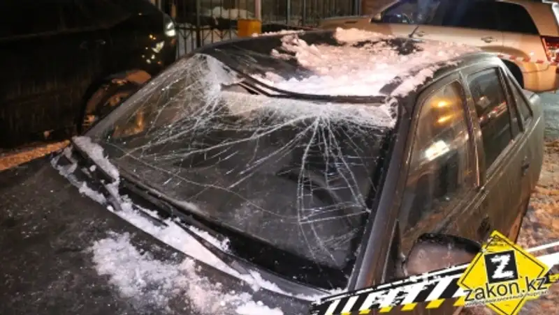 В Алматы упавший с высотки снег разбил две машины