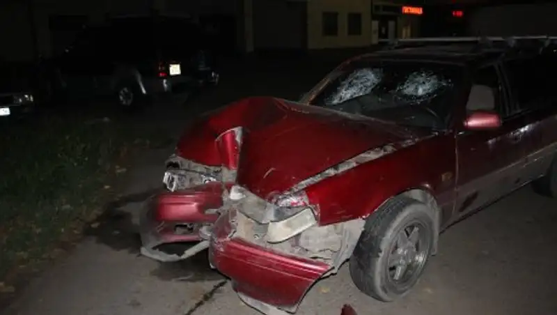 Mazda ехала по Северному кольцу в южном направлении. По словам водителя, не доезжая поворота на мкр."Айнабулак", когда он ехал в среднем ряду, его подрезала какая-то темная машина и даже немного задела. От испуга от дал руля вправо и машину занесло в столб находящийся перед заправкой.