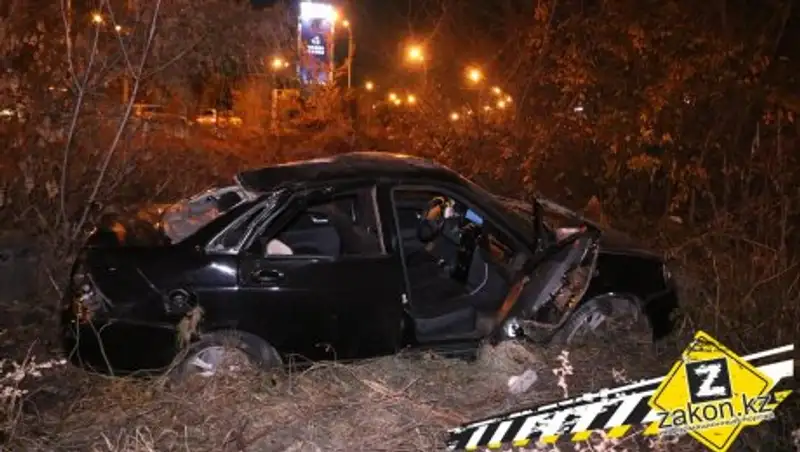 ДТП произошло около 01:00 по пр. Сейфуллина между ул. Тимирязева и пр. Аль-Фараби. Водитель Lada двигался по Сейфуллина в северном направлении. По всей видимости он не справился с управлением на затяжном повороте. Автомобиль начало швырять, его швырнуло через полосу встречного движения на обочину. Priora кувыркалась в кустах еще около 30-ти метров, после чего остановилась.