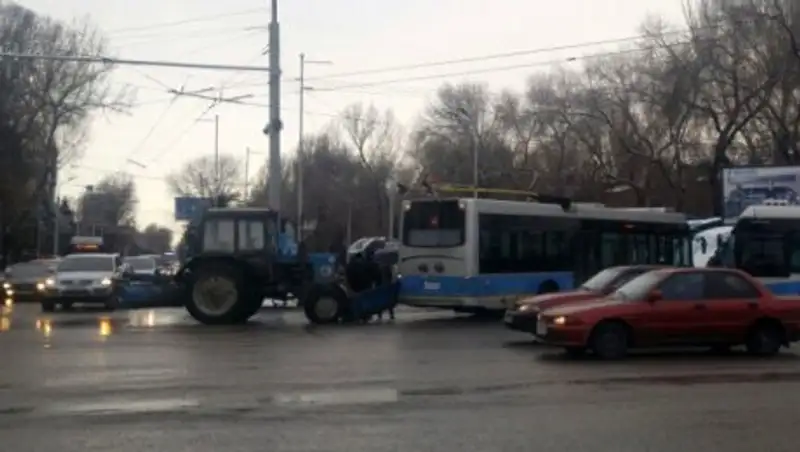 Авария произошла на пересечении проспекта Достык с улицей Абая. Водитель трактора не успел остановиться и врезался в троллейбус, который медленно поворачивал налево. Из-за дорожно-транспортного происшествия на этом участке образовался затор. Троллейбусы не могут продолжать движение и останавливаются перед местом аварии, сообщает motor.kz.