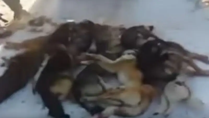 На кадрах видео несколько куч с трупами животных, примерно по 10-15 собак в каждой, лежат на окровавленном снегу. Сотрудники, ответственные за убой, продолжают выгружать трупы, при этом вслух пытаясь определить породу собак.
