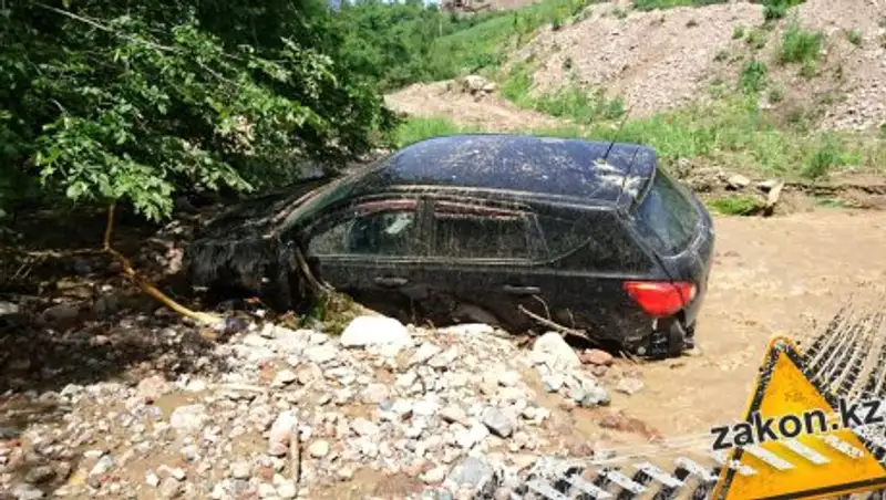 Один из сошедших грязевых потоков смыл с дороги в реку Котырбулак машину. Там авто проплыло около 50 метров и увязло.