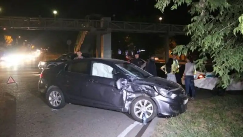 Как повелось, девушка на Hyundai хотела проскочить, в данном случае через пр. Райымбека, но Sprinter не отреагировал, как она ожидала, и буквально снес ее автомобиль. От удара, по словам очевидцев, ее прилично отбросило, и она колесами автомобиля уперлась в бордюр.