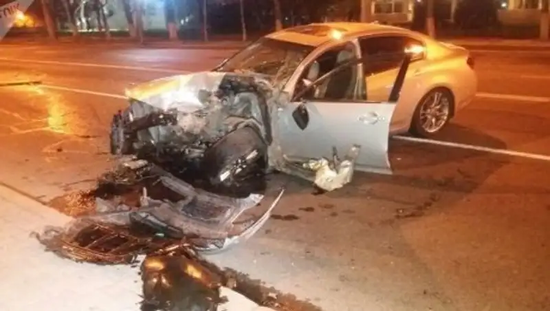 BMW двигался по улице Сатпаева, за ним ехал Infiniti G35 с сильным превышением скорости. Водитель Infiniti, решив обогнать BMW, выехал на полосу встречного движения, однако там навстречу ехал автомобиль и Infiniti попытался вернуться на свою полосу.