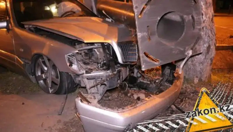 Авария произошла на перекрестке проспекта Абая и улицы Наурызбай батыра. Иногородний водитель, не знакомый с расположением улиц, к тому же уставший, не заметил, что при движении вверх по Наурызбай батыра улица после проспекта Абая сужается и уходит в сторону. Проехав по прямой, мужчина за рулем Mercedes w140 перелетел через арык и снес рекламные конструкции.
