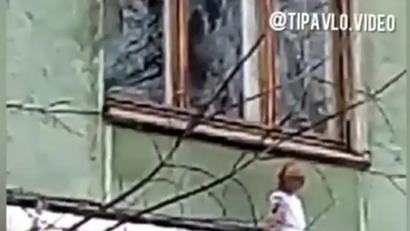 Из окна второго этажа, на уровне которого сидит мальчик, высунулся мужчина и затянул его в квартиру.