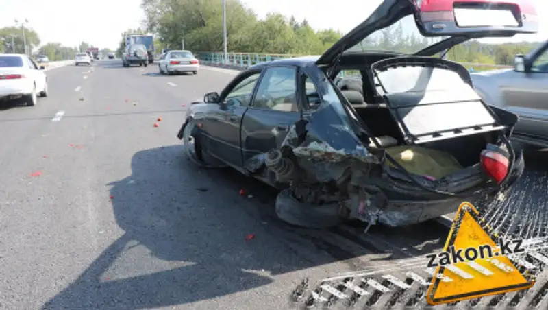 Mazda 626 ехал по крайней правой полосе по трассе в сторону Капшагая. В не спеша двигающийся Mazda, на полном ходу врезался Mitsubishi Galant. От сильного удара заднюю часть Mazda сильно деформировало, вырвало колесо, и повредилась передняя часть. Неуправляемый Galant опрокинулся на крышу и проехал еще несколько метров.