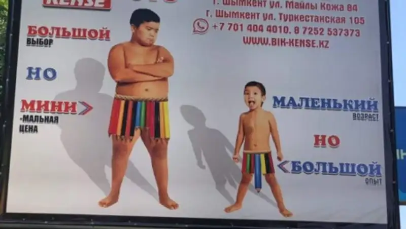 Билборд сомнительного содержания появился на одной из улиц Шымкента. У плаката явно сексуальный подтекст и на нем фотографии детей, сообщает Zakon.kz.