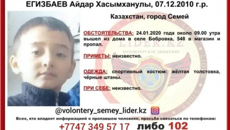 - Устанавливается местонахождение Айдара Егизбаева 2010 года рождения, который 24 января примерно в 9:00 утра ушел из дома и не вернулся, - сообщила пресс-секретарь ДП ВКО Айгерим Нургазина. - Заведено разыскное дело.
