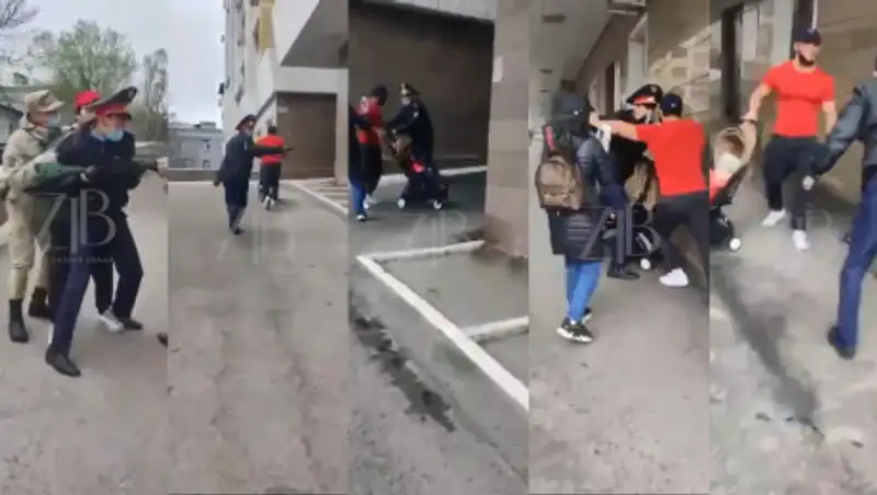 На видео патруль, по всей видимости из представителей ВС РК удерживает человека в полицейской форме, который вырывается и бросается на бородатого мужчину в красной футболке, везущего по тротуару коляску с ребенком.