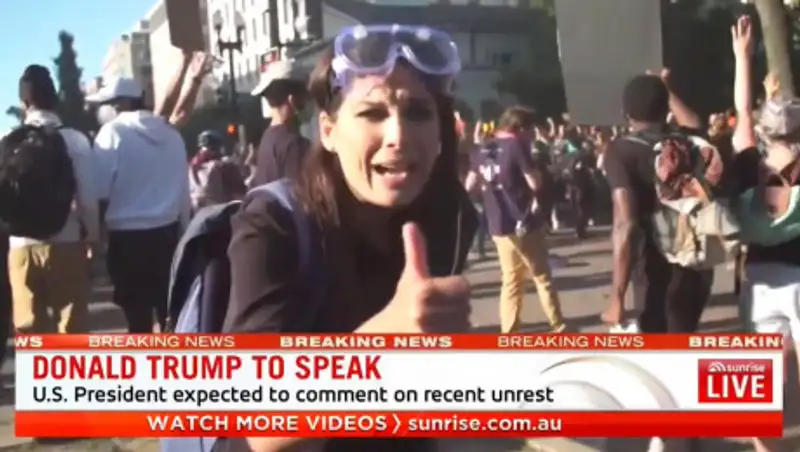 Watch the shocking moment #7NEWS reporter @AmeliaBrace and our cameraman were knocked over by a police officer LIVE on air after chaos erupted in Washington DC. pic.twitter.com/R8KJLnfxPN
