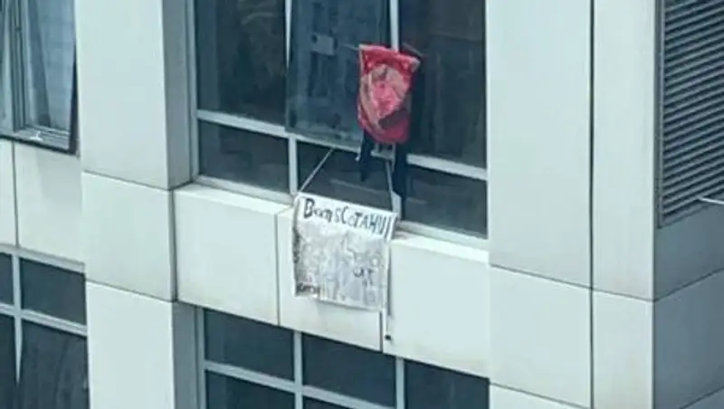 Жильцов эвакуировали. Мужчина вывесил плакат с плохоразличимой надписью.