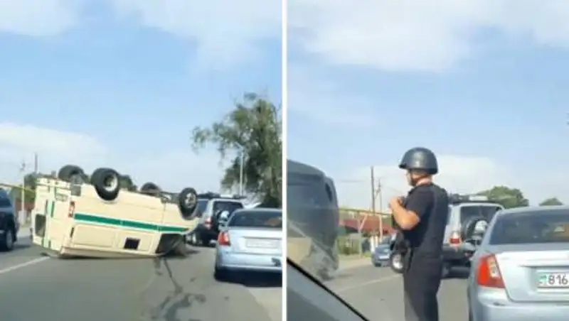 В казахстанских соцсетях появилось видео, на котором посреди дороги лежит перевернутый на крышу инкассаторский автомобиль, сообщает zakon.kz.