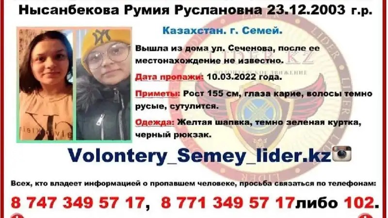 Всех, кто владеет информацией о пропавшей, просят позвонить по телефонам: +7-747-349-57-17,+7-771-349-57-17, либо 102.