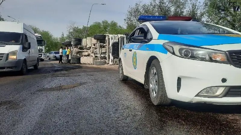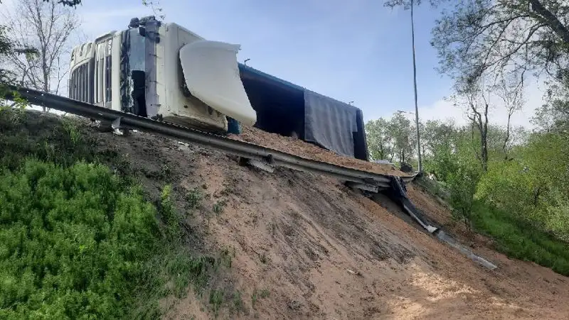 Грузовик с прицепом поворачивал с Северного кольца на Капшагайский мост. В какой-то момент он стал наклоняться вбок и зацепил отбойник. Фура, груженая песком, опрокинулась на бок. Отбойник не дал грузовику упасть с развязки, передает Zakon.kz.