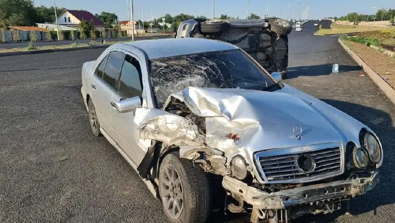 Водитель Mercedes не успел среагировать и влетел в Mazda на полном ходу, которая от столкновения опрокинулась на бок.
