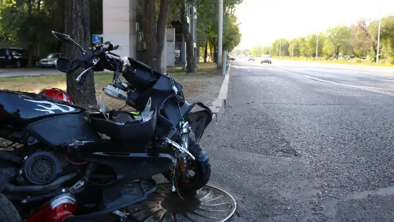Как удалось узнать на месте происшествия, водитель автомобиля марки Toyota Highlander двигался по улице Брусиловского в южном направлении. И когда автомобиль почти проехал перекресток, в него на высокой скорости врезался мопед, двигавшийся по проспекту Райымбека в восточном направлении.