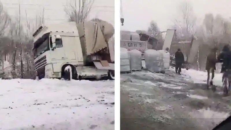 В Петропавловске большегруз сошел в кювет из-за снегопада
