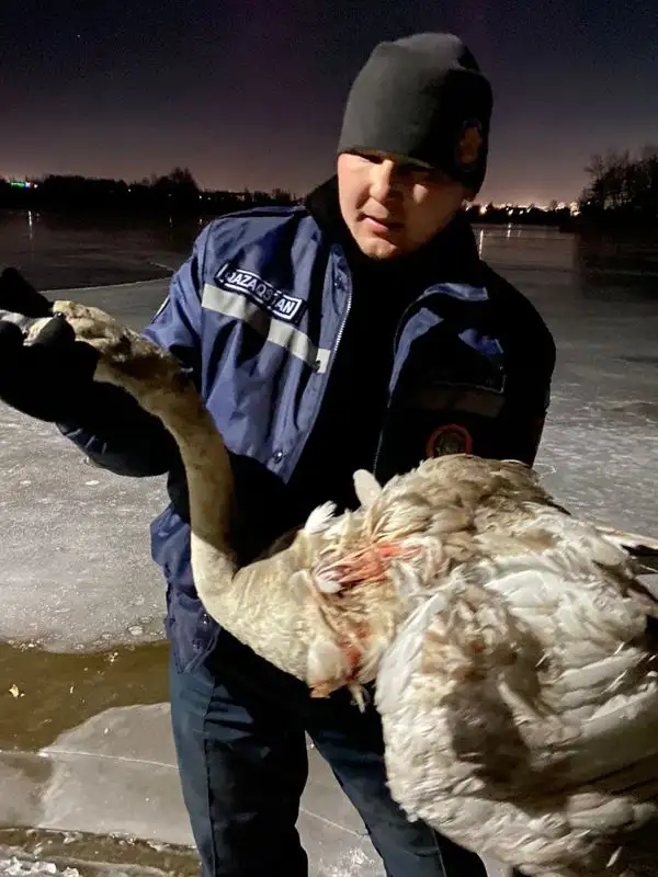 Замерзающего лебедя спасли сотрудники ДЧС в Актобе