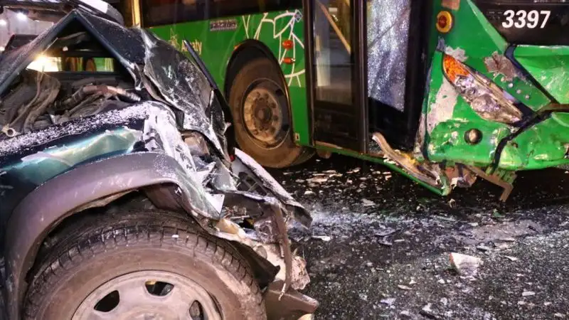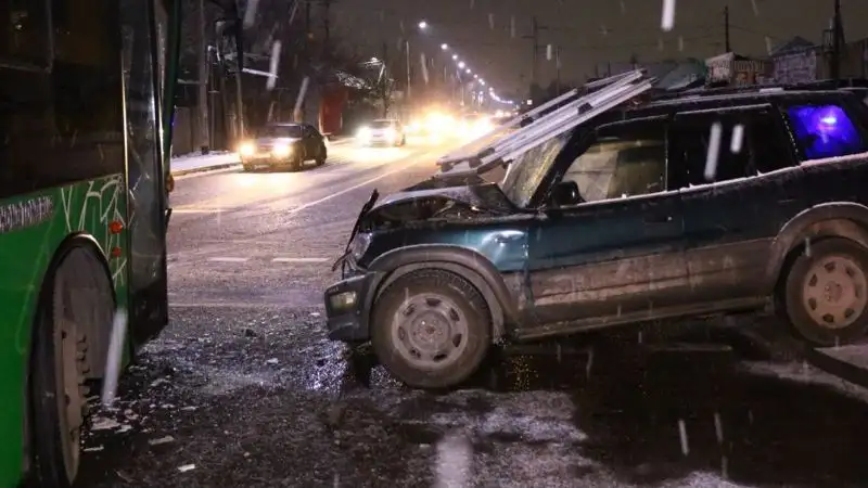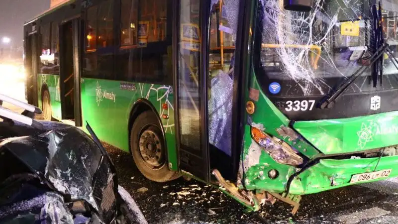 В Алматы произошло лобовое столкновение автобуса и RAV4