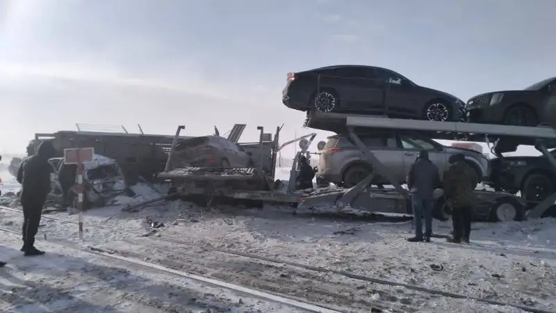 20 февраля 2023 года примерно в 15:50 на железнодорожном переезде "Жазык" трассы Самара - Шымкент произошло ДТП с участием поезда и автовоза, сообщает Zakon.kz.