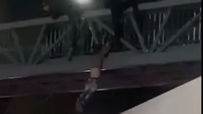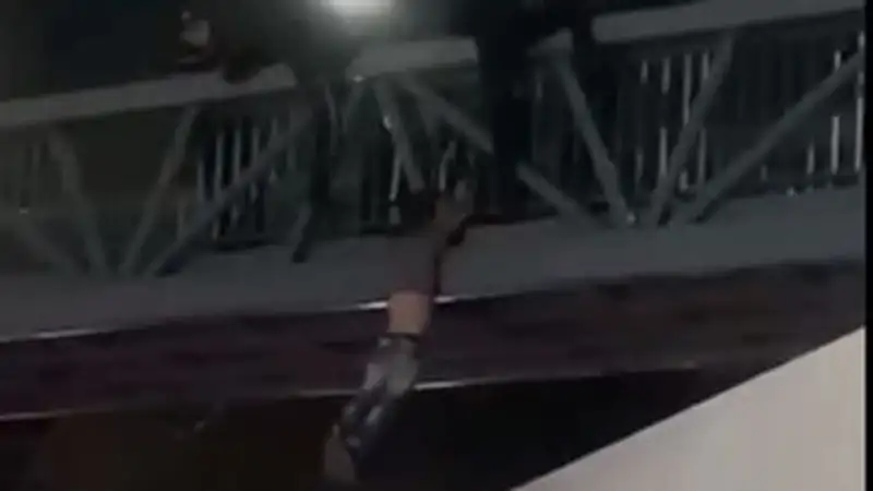 В казахстанских соцсетях появилось видео, на котором мужчина повис на руках на пешеходном мосту над проезжей частью, а полицейские пытаются его спасти. По всей видимости, инцидент произошел на проспекте Суюнбая в Алматы, сообщает Zakon.kz.