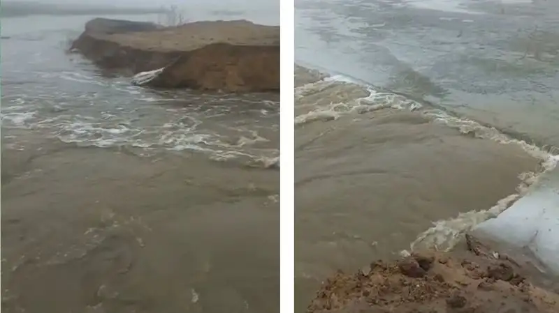 В селе Акбулак на дамбе, переполненной талой водой, прошел пролив воды с одной стороны в сторону населенного пункта, сообщает Zakon.kz.