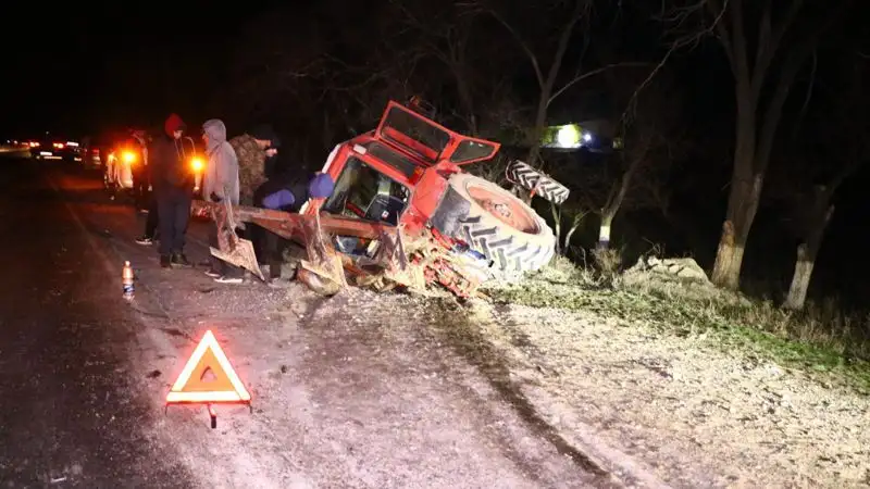 От мощного удара у трактора оторвало колесо, тягач понесло на обочину, где он опрокинулся на бок.