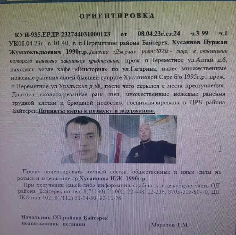 Пострадавшая жива. Ее госпитализировали в Центральную районную больницу района Байтерек. Подозреваемый находится в розыске.