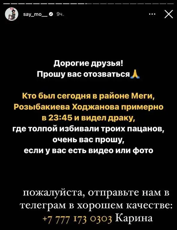Подробностями инцидента поделилась казахстанская певица, рэп- и хип-хоп-исполнительница Молдир Есембек (более известна под творческим псевдонимом Say Mo). По ее словам, толпа парней избила троих сверстников. Один из них, как отметила артистка, – братишка ее подруги.