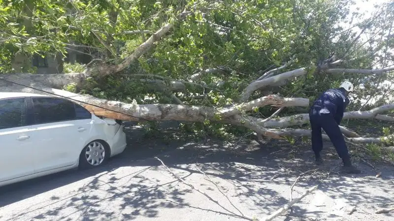 4 мая в 12:20 на пересечении улиц Кабанбай батыра и Ерманова в Аль-Фарабийском районе из-за сильного ветра (порывы до 23 м/с) на легковой автомобиль упало дерево. Погибших и пострадавших нет.