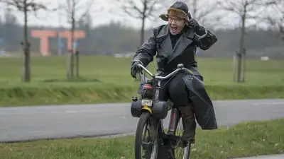 На кадрах молодой человек едет на мопеде, взобравшись на водителя.