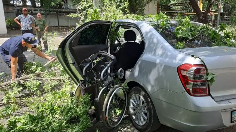 Такси подъехало к зданию, где расположен Центр социальной поддержки Турксибского района. В машине находилась пассажирка – женщина с инвалидностью. Водитель вышел из автомобиля, достал из багажника инвалидную коляску и начал помогать пассажирке выбраться из салона, чтобы посадить ее в коляску. В этот момент на машину сверху рухнула крона старого дерева, ствол которого переломился пополам.