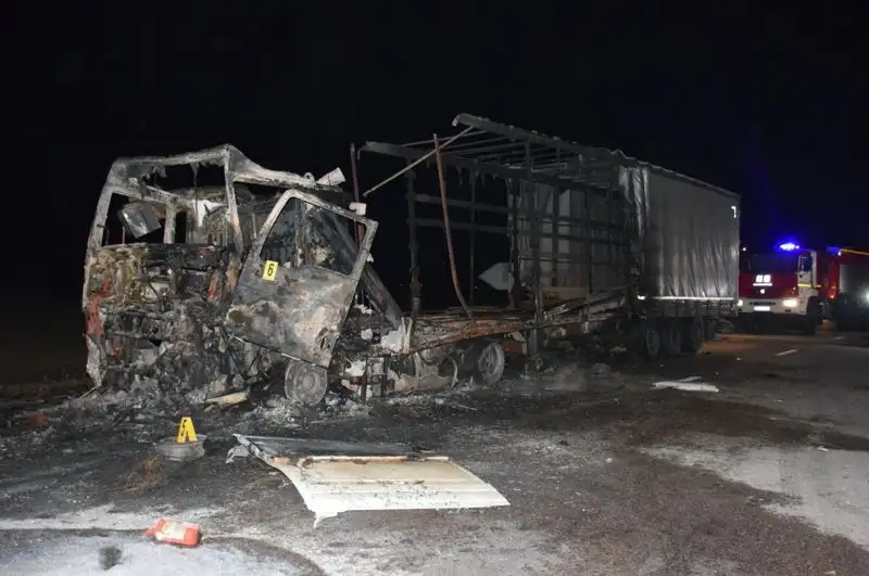 Грузовик и Toyota сгорели после ДТП в СКО: погибли два человека