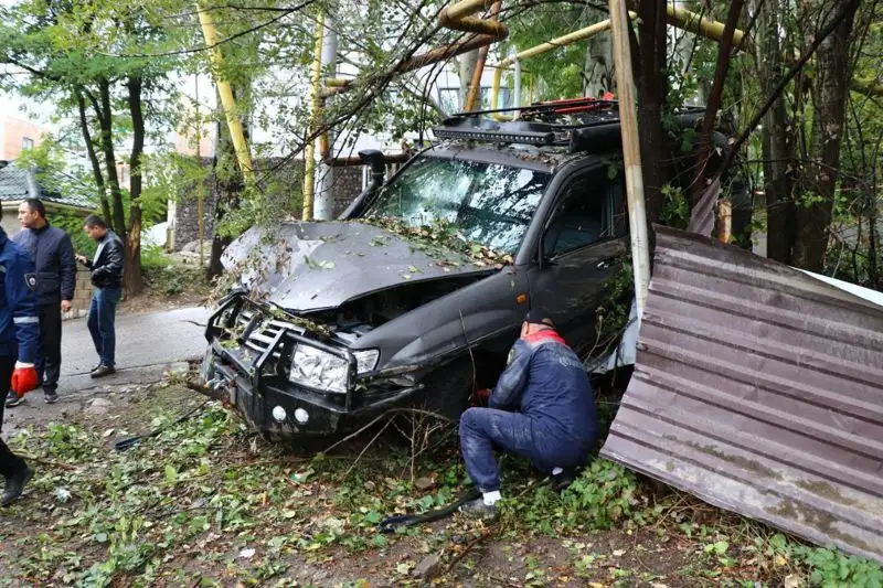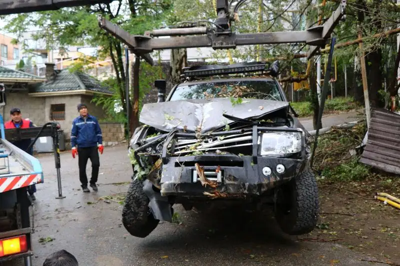На улице Керей-Жанибек хандар, спускаясь с крутого подъема, на повороте, водитель автомобиля Toyota Land Cruiser не справился с управлением и через полосу встречного движения вылетел с дороги, перелетев арык. После машина снесла газовые опоры. В итоге Toyota застряла между деревьями и опорами газовых труб.