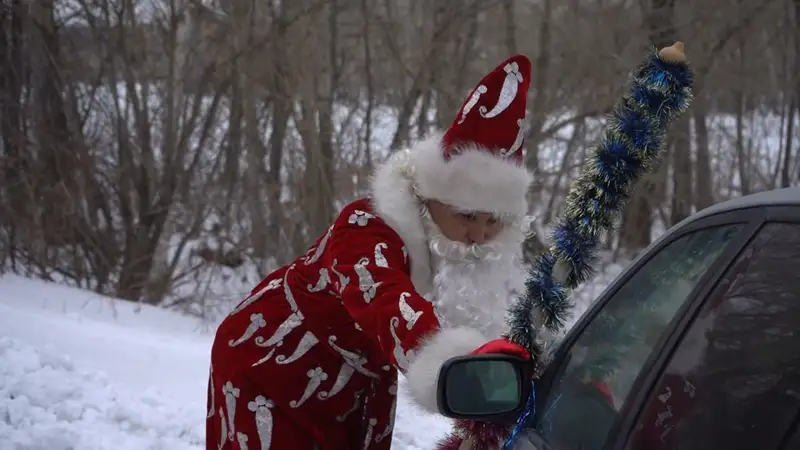 "Замерзающим Дед Морозу и Снегурке на помощь прибыли спасатели ДЧС ВКО, которые на высокопроходимой технике эвакуировали их с автодороги. "Путников" обогрели и проинструктировали еще раз, как опасно выезжать в метель. Также спасатели показали, как подготовить автомобиль к зимней дороге. И вручили Дедушке Морозу мешок, в который уложили трос, провод для "прикуривания", запас горючего, лопату, фонарик, теплые вещи, продукты питания, запасное зарядное устройство для телефона". Пресс-служба ДЧС ВКО