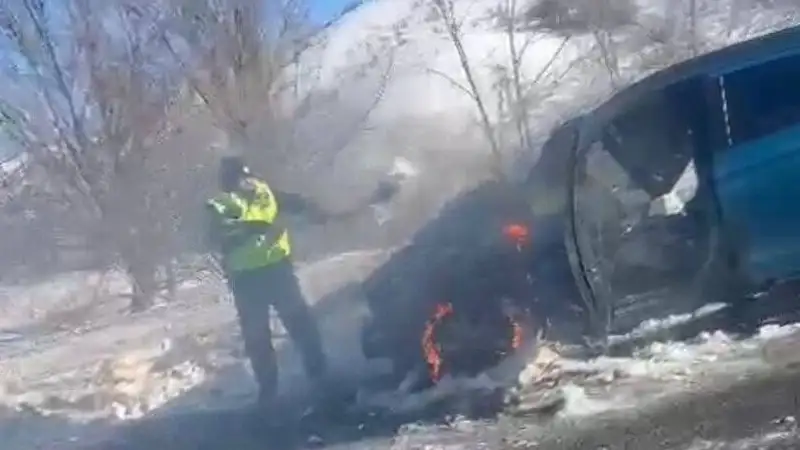 В Восточно-Казахстанской области загоревшийся на трассе автомобиль потушили полицейские, сообщает Zakon.kz.