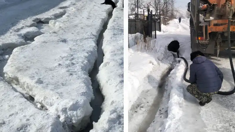 Если летом вода несет прохладу, то зимой пугает потопом. Коммунальщики регулярно промывают арык кипятком. Но из-за продолжительных 40-градусных морозов он все-таки промерз, и ручей устремился к домам и дворовым постройкам.