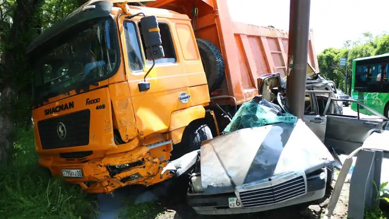 Жуткое столкновение грузовика с Mercedes произошло в Алматы