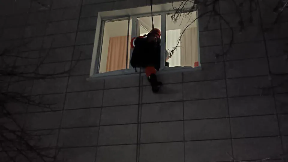 Спасатели оперативно-спасательного отряда МЧС с помощью альпинистского снаряжения спустились с окна третьего этажа и проникли через окно в квартиру второго этажа и открыли дверь изнутри.