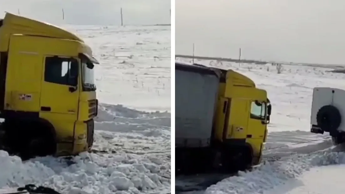 По информации МЧС РК, оперативно прибывшие спасатели, используя специальную технику и трос, отбуксировали фуру на очищенный участок дороги.