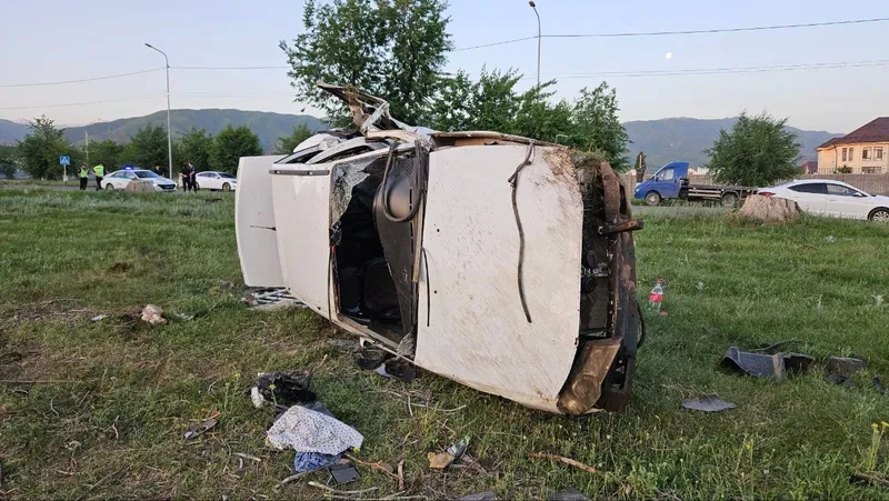 От сильного удара автомобиль сильно искорежило, и он улетел далеко в поле. Во время переворотов люди, находившиеся внутри, повылетали наружу.