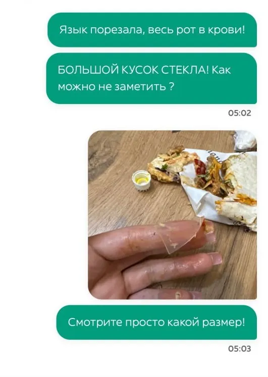 "После смены в четыре утра уставшая, голодная решила заказать, как обычно, донер. Сижу и наслаждаюсь едой, вдруг, когда жевала со вкусом донер, почувствовала вкус крови и что-то острое. Достаю, а там стекло!" – возмутилась заказчица еды на дом.